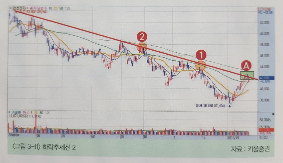 - 하락추세선을 상향돌파할 때 매수(A지점), 손절은 직전 최저점(36,850원)