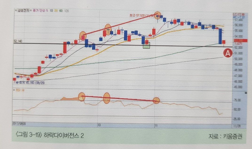 - 다이버전스를 이용한 매도 : 가격 상승중에 RSI최고점이 하락하고 이전 최저점을 깨는 시점