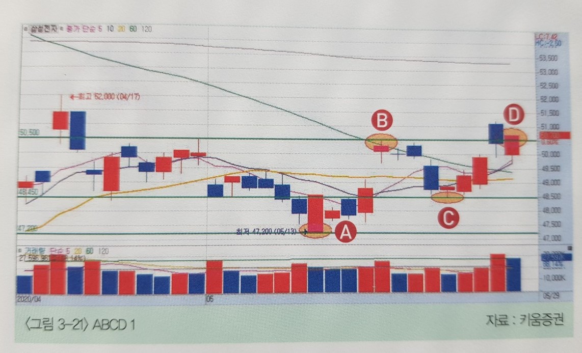 : 연속되는 하락으로 나온 최저점을 A로 하고 이후 최고점을 B라 하고, A, B 사이가격의 최저점을 C라 하고 최고점 B를 돌파하는 D에서 매수, 손절은 C이하로 하락 시(C-D간격이 작을 경우에는 A이하로 하락 시)