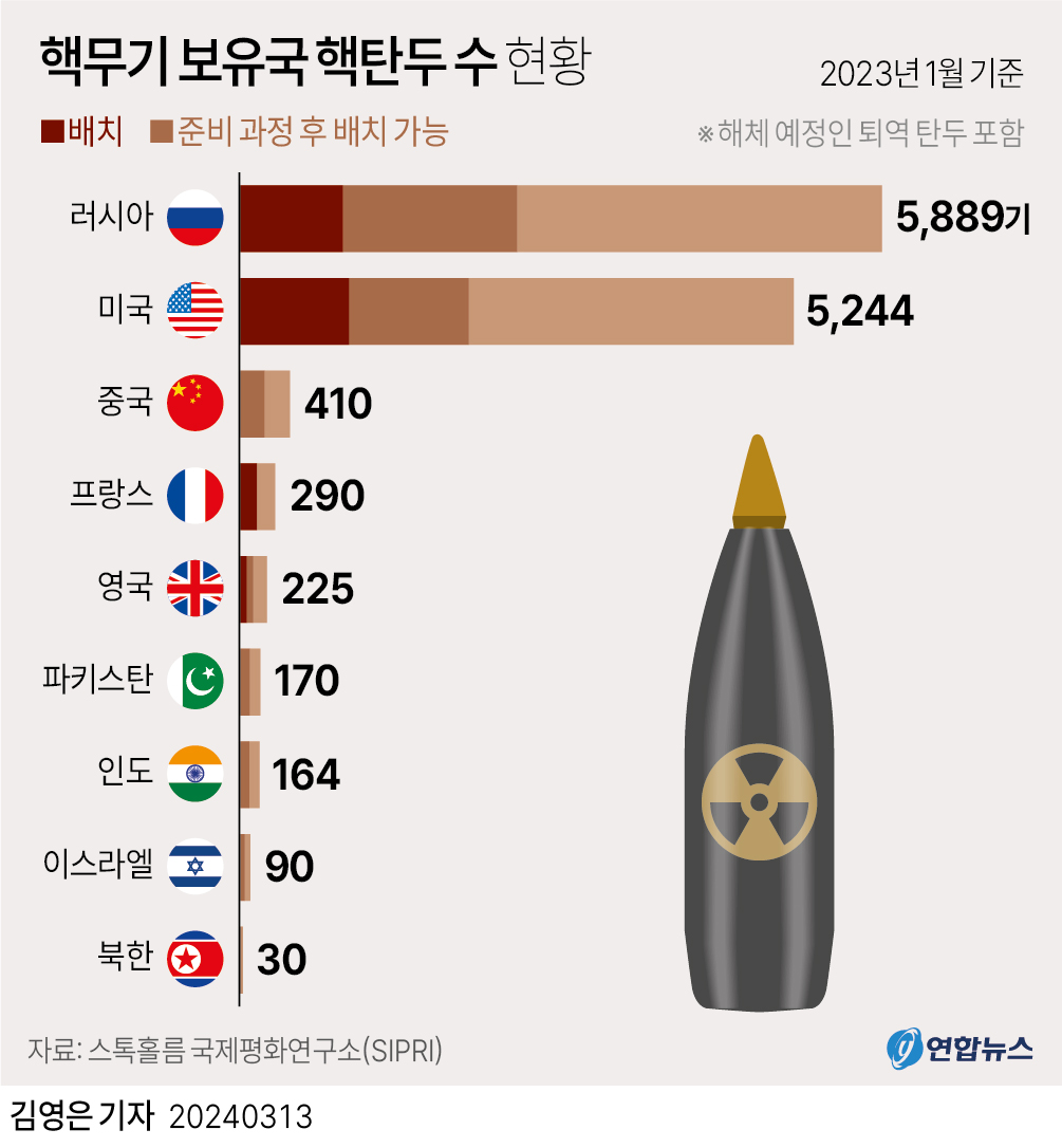2024년 1월에 스톡홀름국제평화연구소(SIPRI)에서 각 국가별로 보유한 핵탄두의 수를 아래 표와 같이 발표하였다.